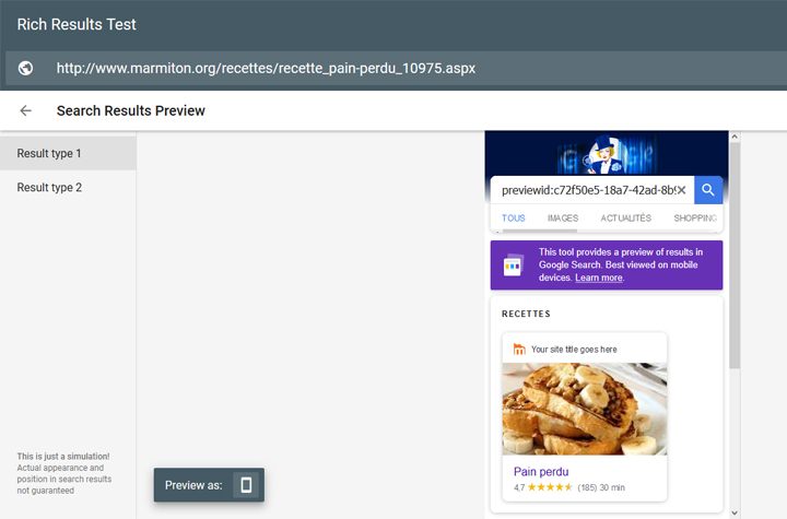 To test if your markup is working properly, you can also use the Rich Results Test tool. First, the tool tells you if your page is eligible for rich results. If this is the case, then you can see what structured data is detected on the page, and then preview how the search result will appear in the SERPs.