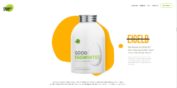 Ce site pour les « Good Eggwhites » − une source de protéines en bouteille − mise sur un design très épuré, en parfaite corrélation avec l’unique produit dont il assure la promotion. À l’arrivée sur la page d’accueil, le visiteur scrolle pour déclencher différentes animations : des paragraphes de texte défilent à la manière d’un générique de film et dans un jeu d’opacité jusqu’à la découverte de la fameuse bouteille qui finit par tourner sur elle-même afin de faire découvrir sa composition au visiteur.
