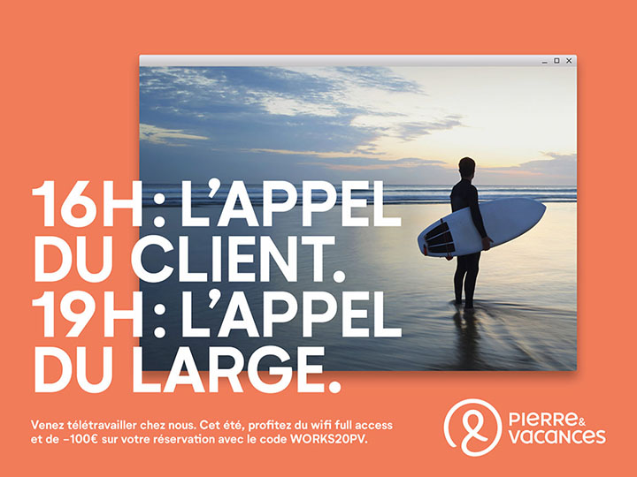 Pierre & Vacances a su rebondir pour surfer sur cette vague du télétravail, en proposant une nouvelle offre spéciale avec réduction pour un long séjour, wifi en haut débit et prêt d’une clé 4G. Début juillet 2020, une nouvelle campagne digitale sur les réseaux sociaux est lancée pour vendre ce séjour adapté. Six visuels invitent à venir télé-travailler en vacances, dans une de leurs locations.